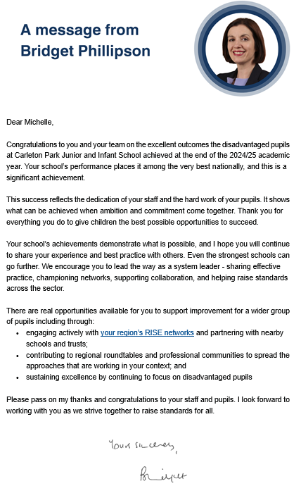 “This success reflects the dedication of your staff and the hard work of your pupils. It shows what can be achieved when ambition and commitment come together. Thank you for everything you do to give children the best possible opportunities to succeed.” –Bridget Phillipson MP